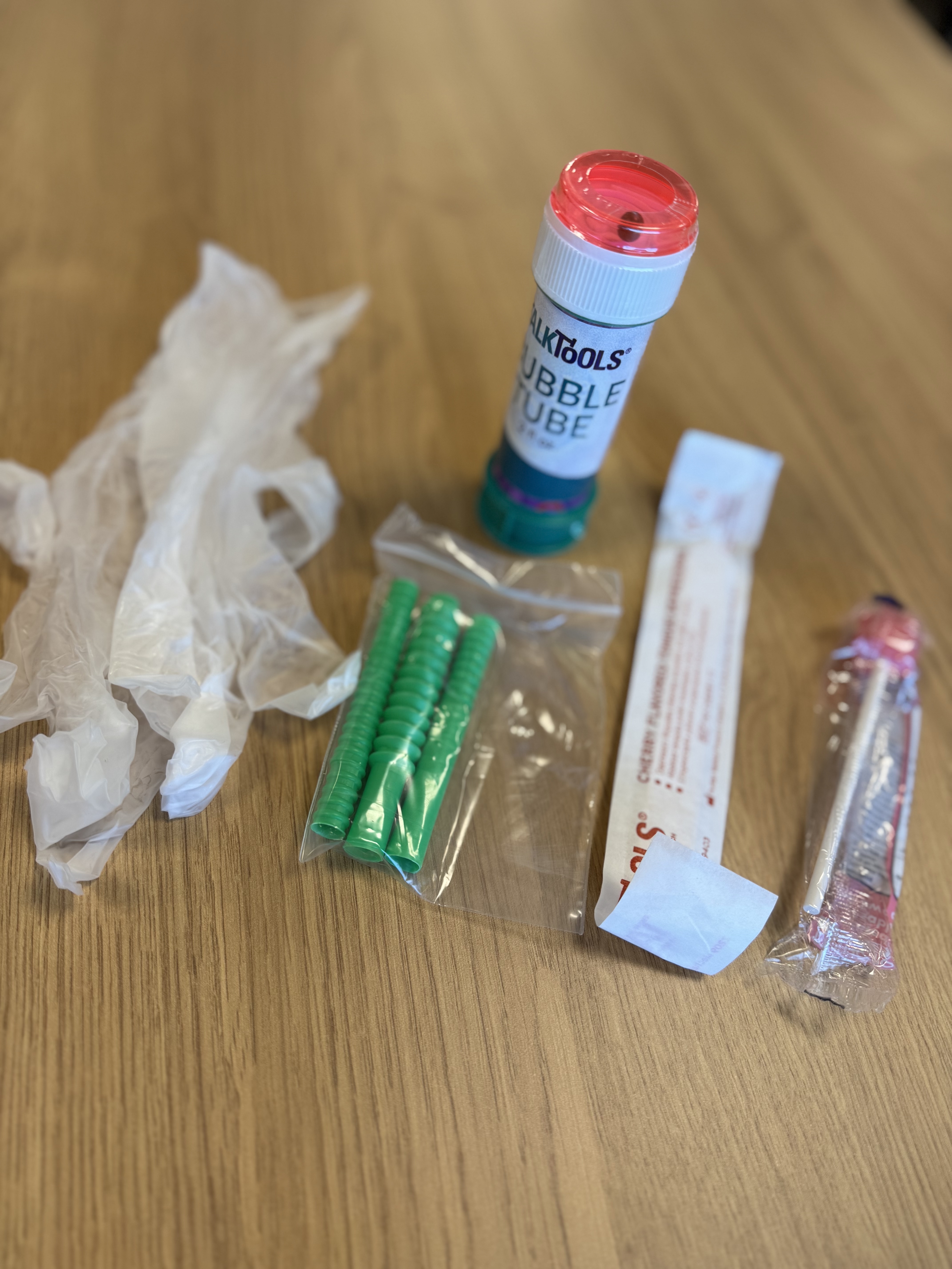 Sæt med sæbebobler, pustepind, tungespartel, toothette, sprøjte og gummihandsker til pustetræning.