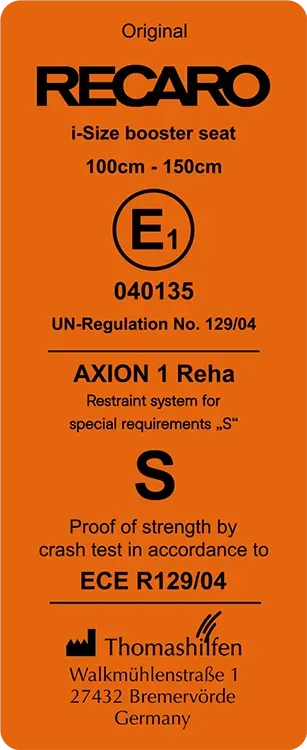 RECARO Axion 1 Reha er testet efter de højeste standarder og certificeret i henhold til ECE R129/03. I samarbejde med Thomashilfen sikrer RECARO mere end 35 års erfaring i udvikling af rehabiliteringsautostole. Du får et produkt, der er gennemtestet, sikkert og lavet til at give dit barn den bedst mulige støtte.