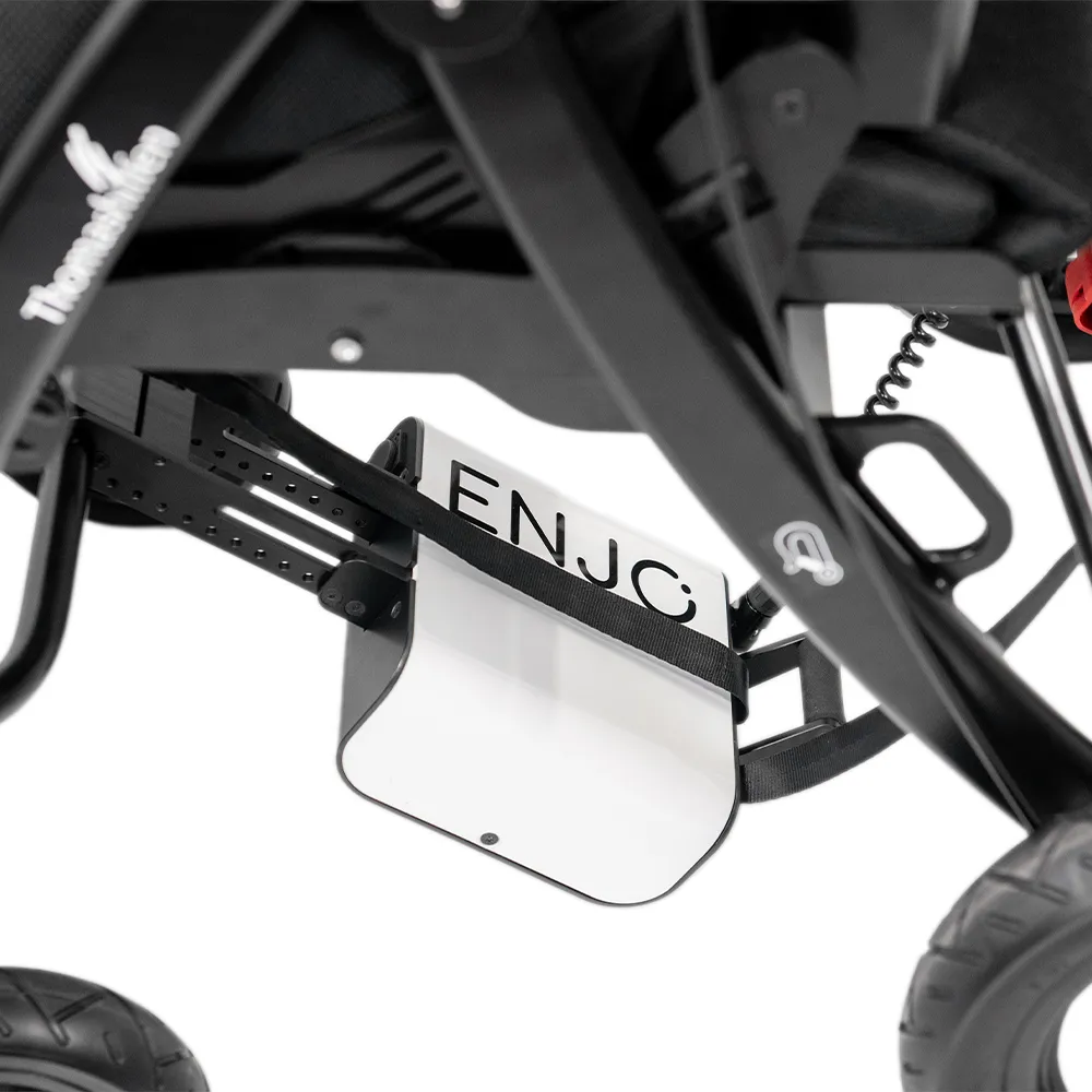 Enjo elektrisk skubbehjælp kan monteres som tilbehør. Enjo bidrager til væsentlig fysisk aflastning af ledsager eller omsorgsperson ved forflytning og transport af bruger i Swifty 3 specialklapvogn.