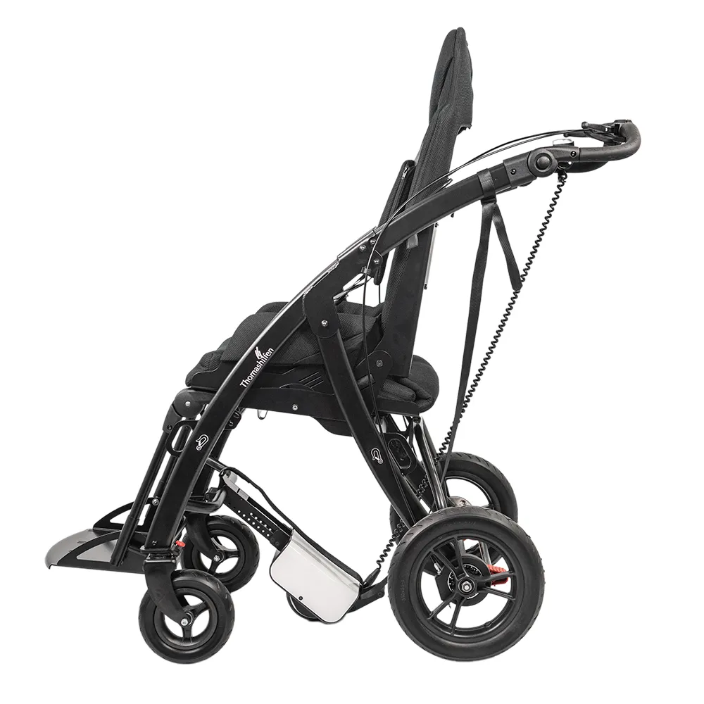 Med en egenvægt på ca. 4 kg kan motorenheden monteres hurtigt og uden brug af værktøj. Systemet understøtter fremdrift og reducerer den nødvendige skubbekraft, hvilket mindsker belastning af skuldre, ryg og håndled – særligt ved længere transportstrækninger, stigninger og ujævnt underlag.